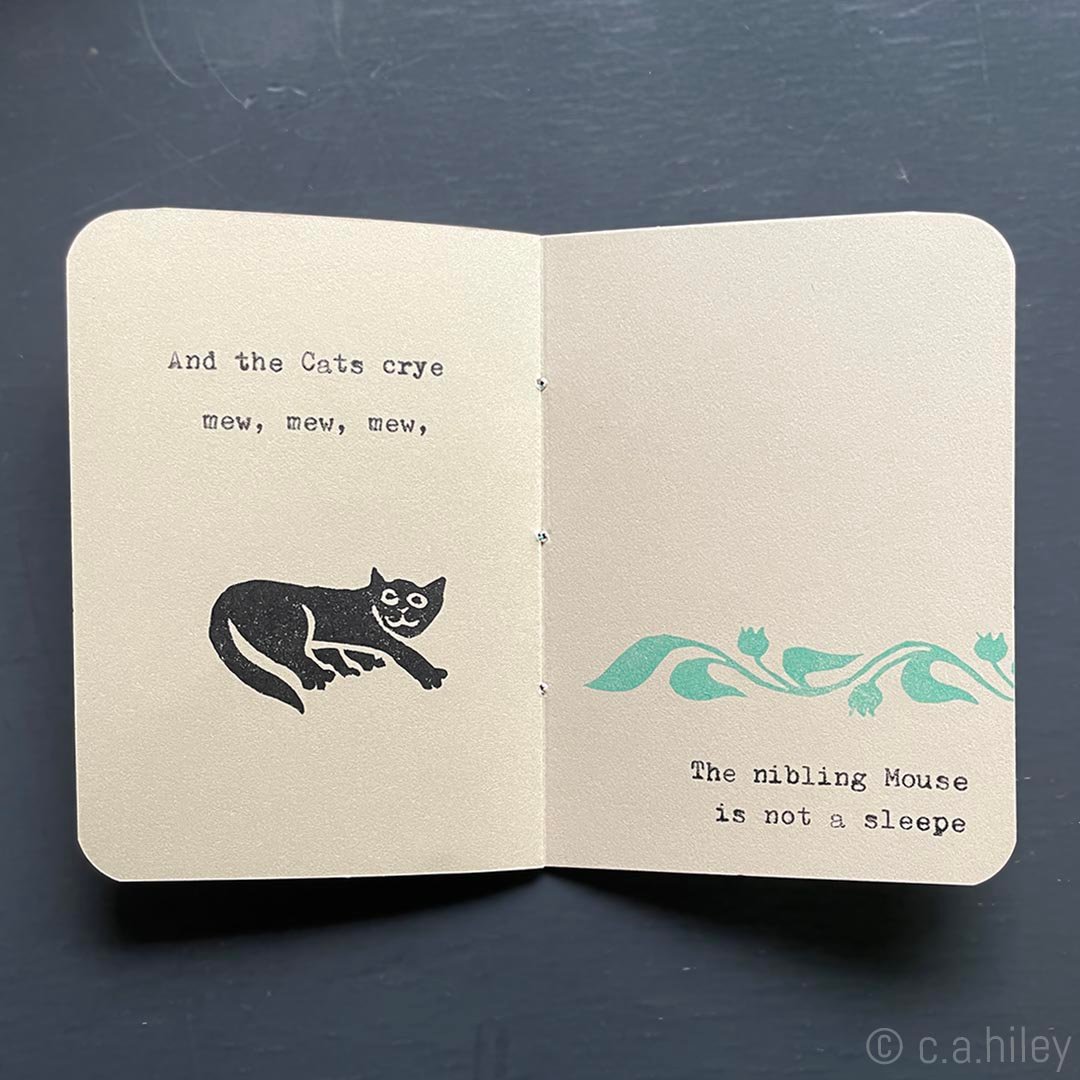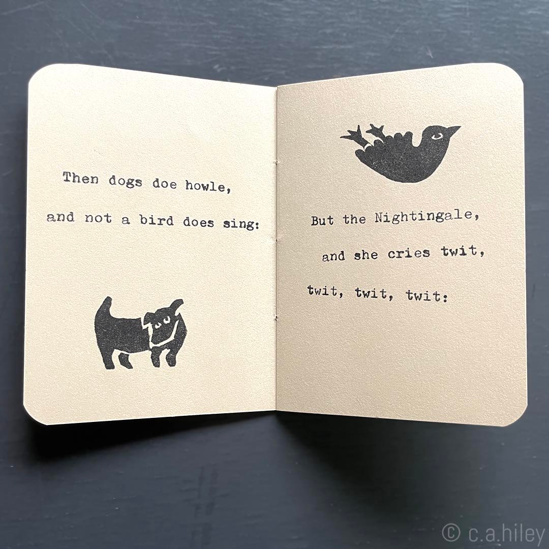 a cute wee book made with my hand-carved stamps and my mother's old Hermed Baby typewriter, this booklet contains the words from a song within the 1602 play "Blurt, Master-Constable", attributed to Thomas Middleton.