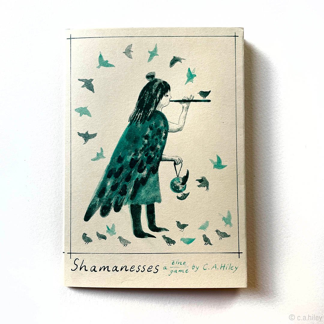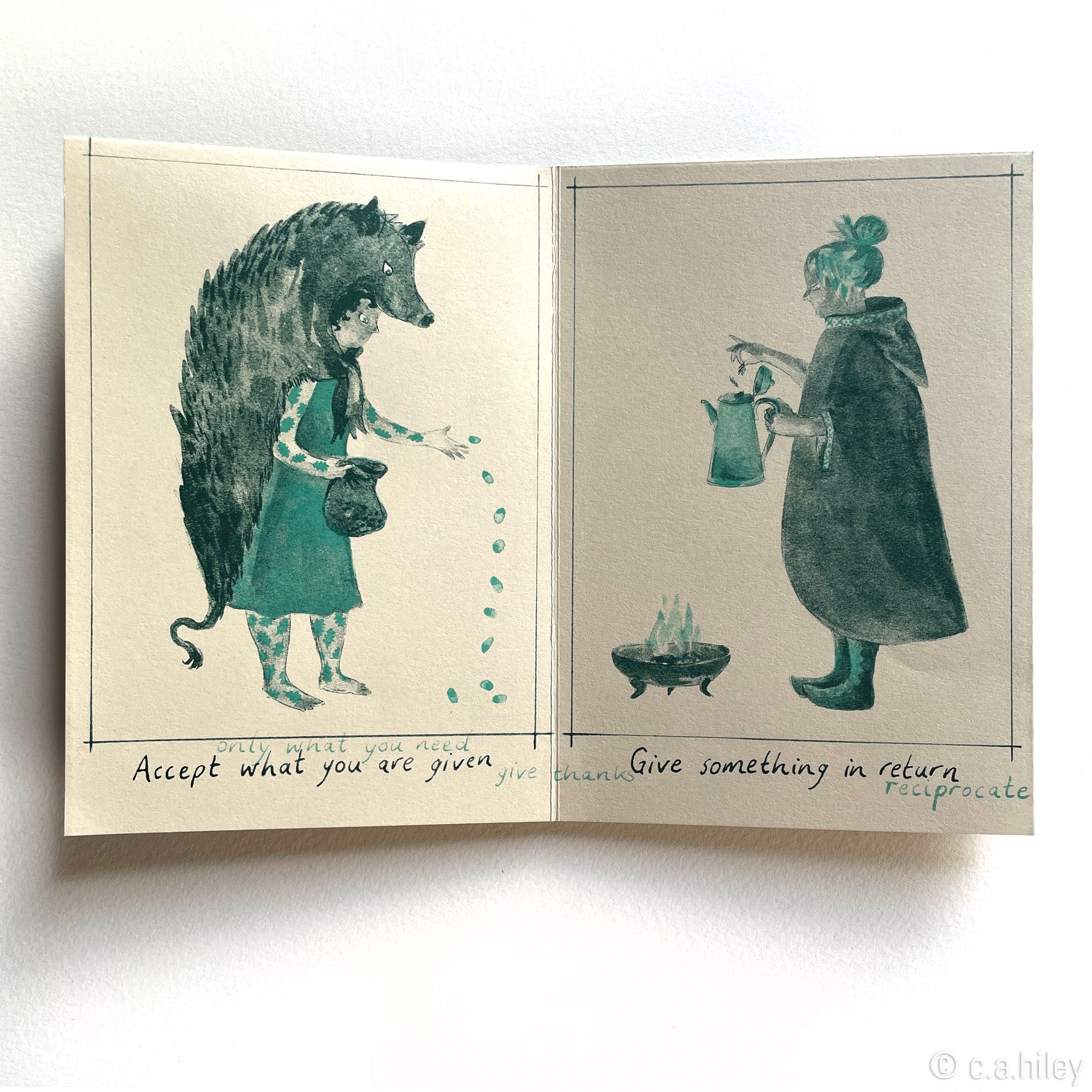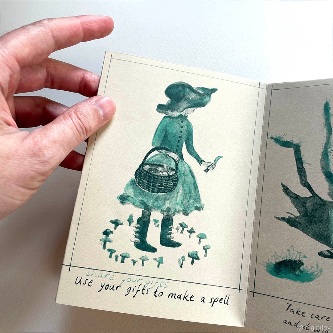 A zine and potential game, with the text hinting at both rules for a boardgame and guidelines for living. Characters are inspired by stages on a walk near my home, the plants and animals to be found there, and a philosophy of sharing and reciprocity with the natural world.